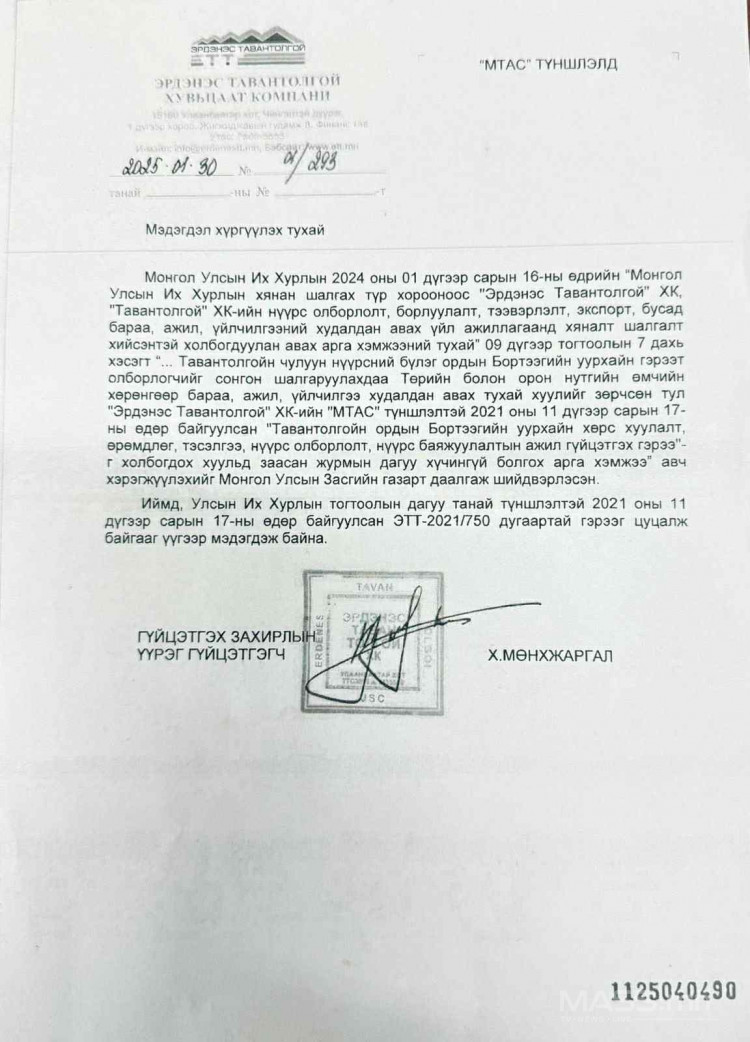 "Бортээг"-ийн орд "Эрдэнэс Тавантолгой" ХХК-ийн мэдэлд байгаа, өмнө нь ч хэн нэгэнд шилжээгүй