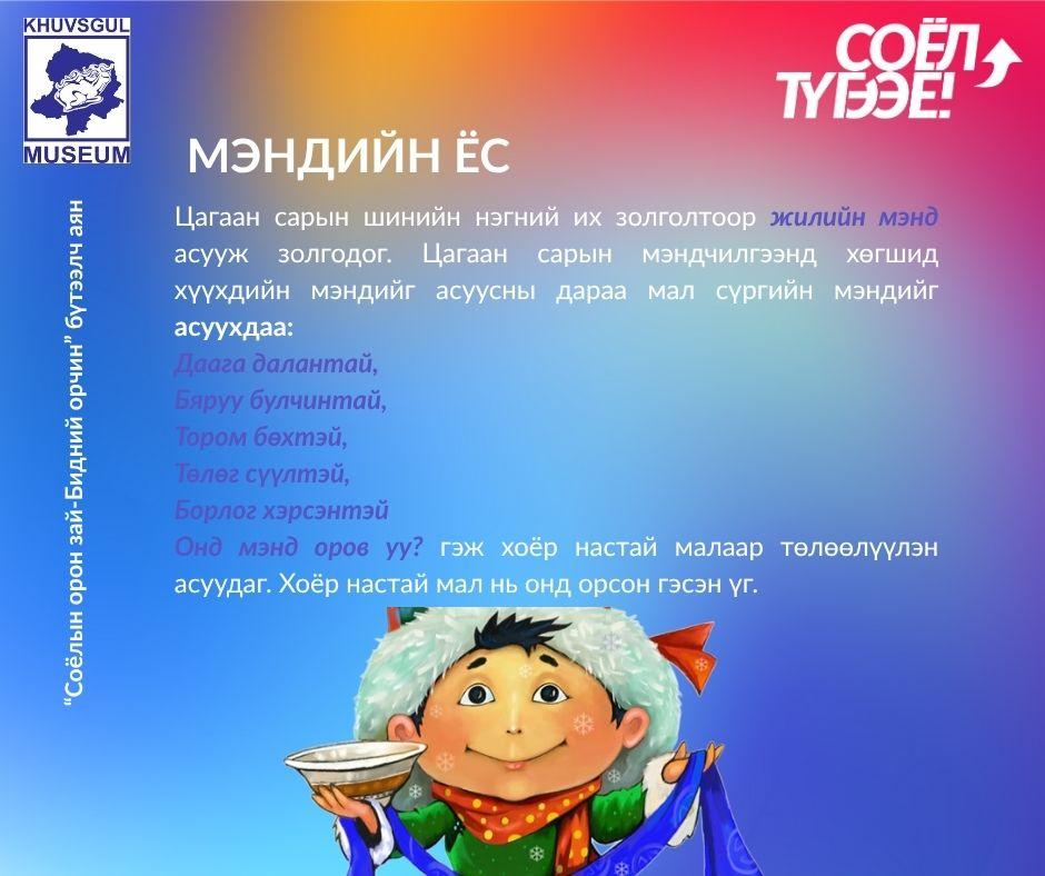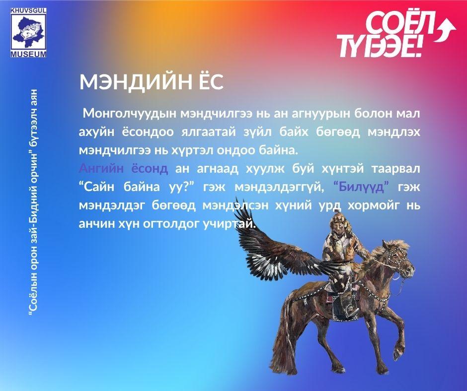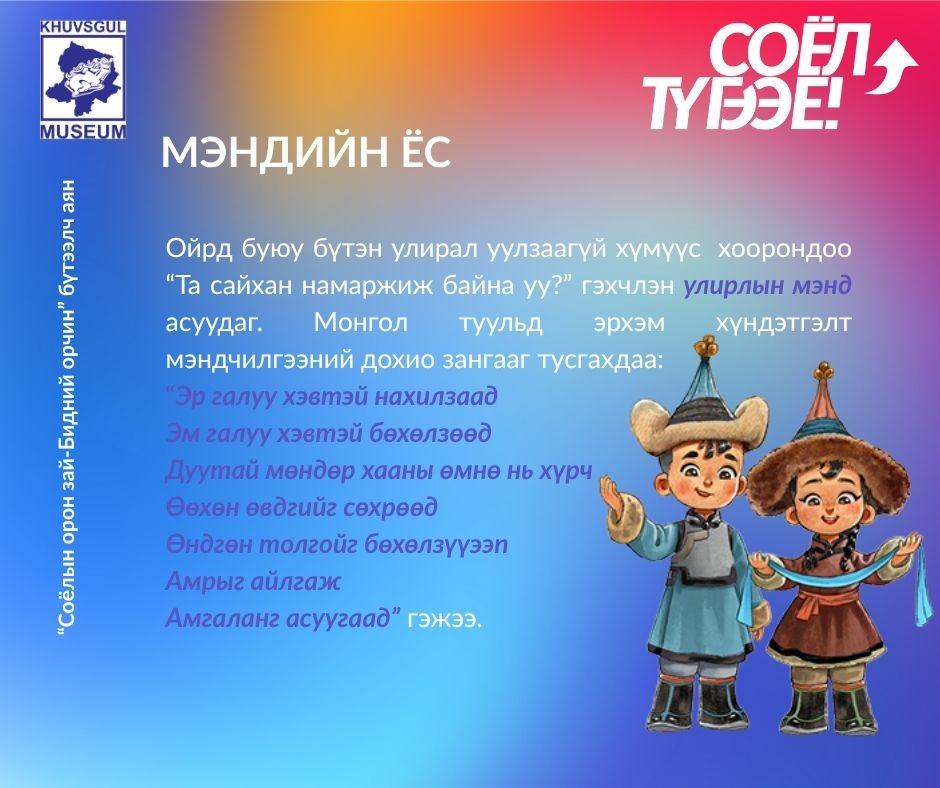 "Соёлын орон зай-Бидний орчин" бүтээлч аяны хүрээнд олон нийтийг соён гэгээрүүлэх зорилгоор Монголчууудын уламжлалт мэндлэх, хүндлэх ёсонг танилцуулж байна.